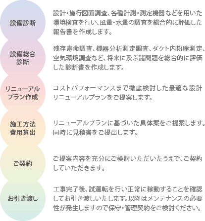空調・給排水設備のリニューアル工事は、建築物における作業環境・生活環境によって大きく異なります。先ずは、現場の状況分析、将来の経年劣化に伴う諸問題を含めて解析することからはじめます。そして、効率性の向上とコスト低減ができる基本プランをご提案します。